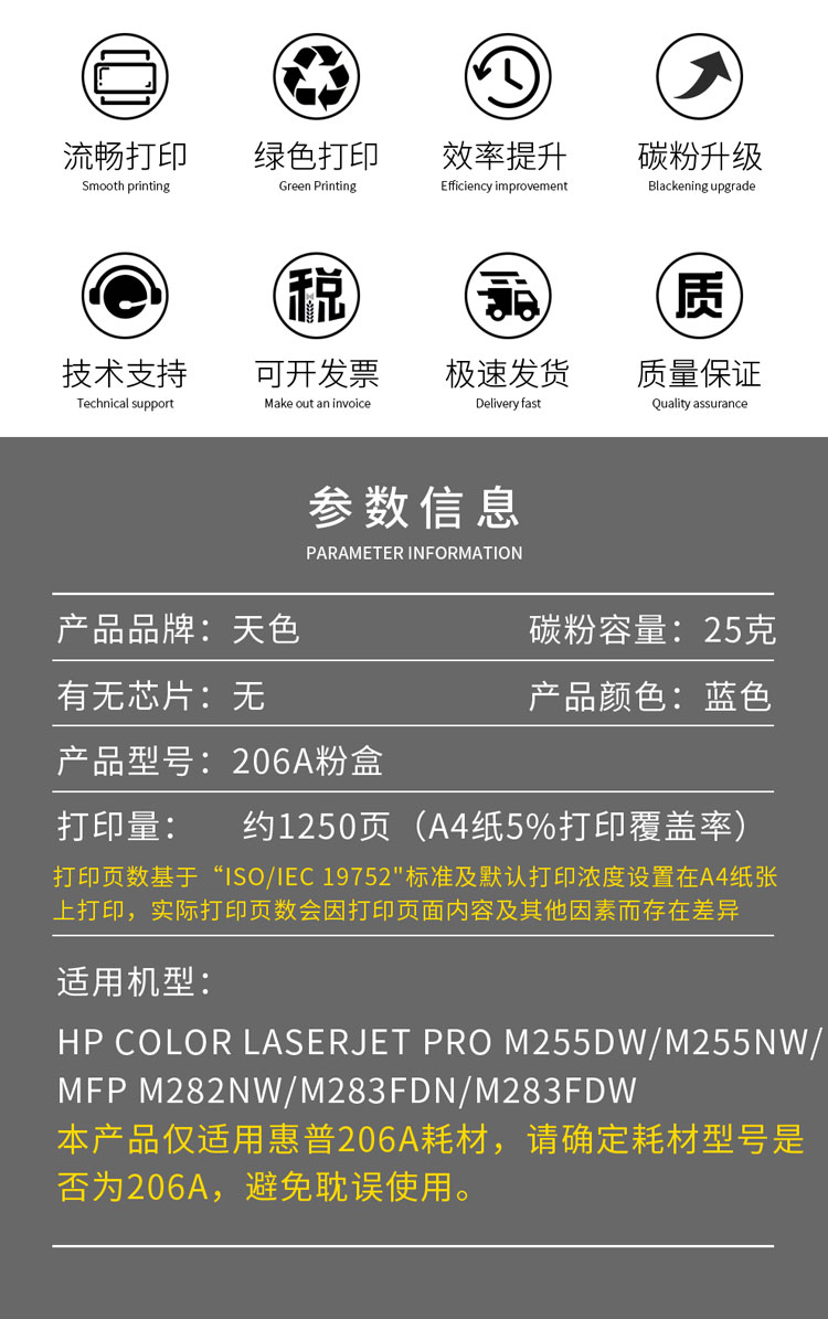 天色207a W2111A蓝色 不带芯片 标准量(1250页)适用惠普M283fdw硒鼓HP 206A M283fdn/cdw M282nw M182n M182nw M255DW墨粉盒207a W2111A蓝色
