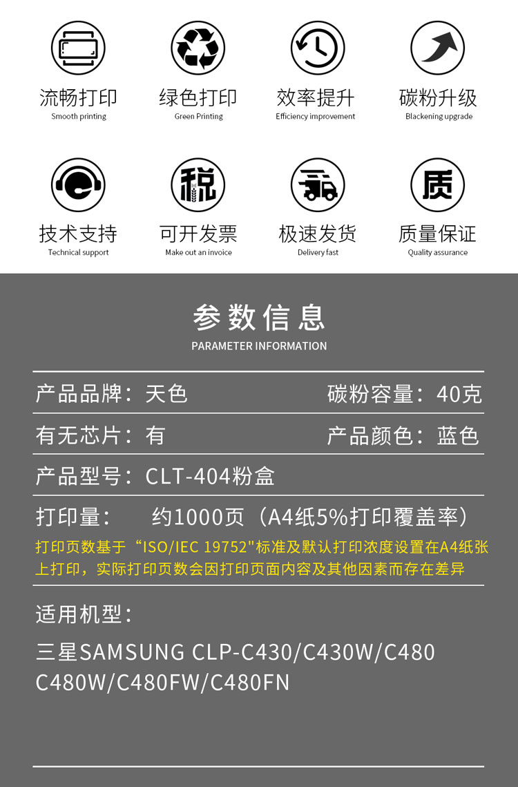 天色CLT-K404S硒鼓蓝色 带芯片(1000页)适用三星C430粉盒C430W C480W硒鼓480FW墨盒C480FN打印机 蓝色