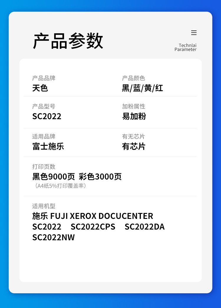 天色(3000页)SC2022粉盒 黄色适用施乐2022粉盒富士施乐SC2022CPS墨粉盒SC2022DA复印机碳粉盒SC2022硒鼓墨盒 黄色