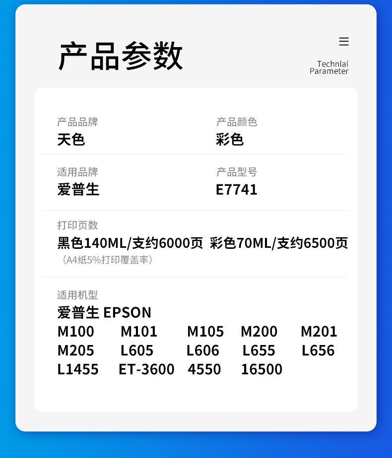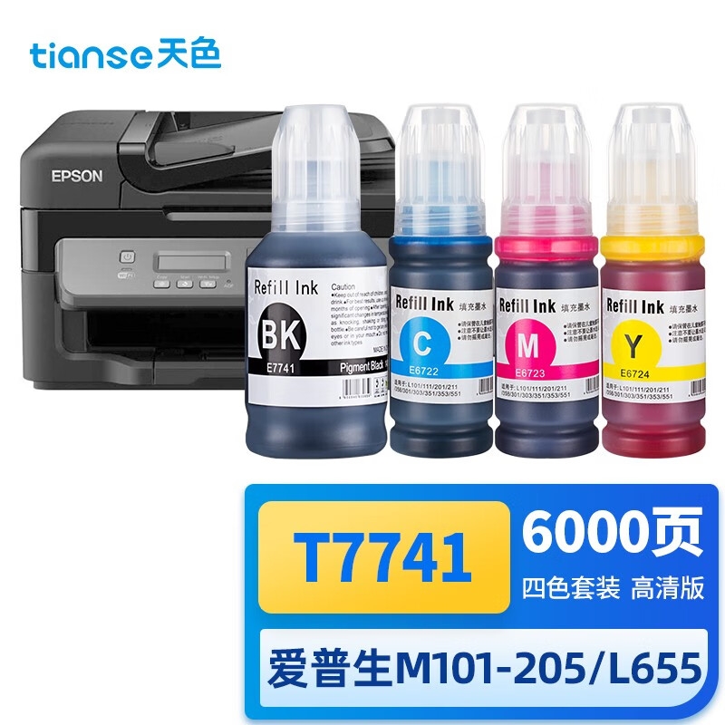 天色T7741墨水 黑彩四色套装用爱普生EPSON M101 M105 M201 M205 M605 L655 L1455打印机 墨水