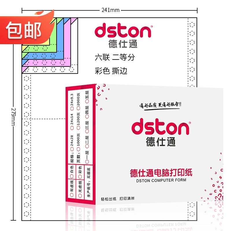 德仕通(dston) 针式电脑打印纸办公 可撕边80列241 二等分1/2打印纸送货单 无碳复写出库单联单 800页 六层彩色